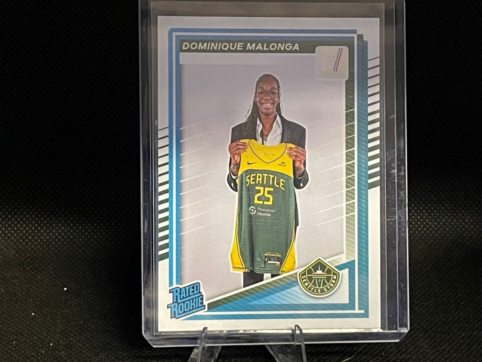 Dominique Malonga is highlighted on this official Rated Rookie card holding her Storm jersey (#25). A standout European talent known for her athleticism and versatility, she represents one of the top collectible rookies of the 2025 WNBA season.