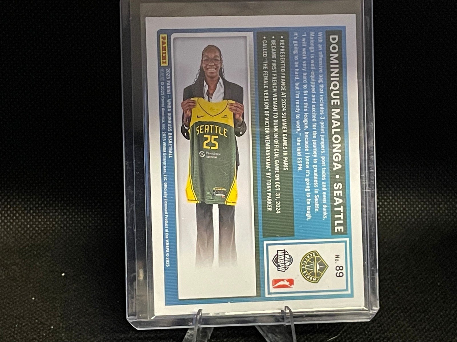 This listing is for a 2025 Panini WNBA Donruss Dominique Malonga Rated Rookie #89 trading card, featuring one of the league’s most exciting young prospects for the Seattle Storm.