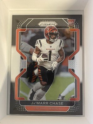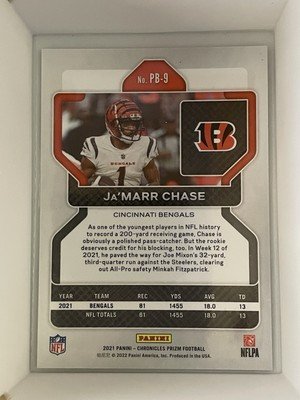 Elevate your sports card collection with the 2021 Panini Chronicles Prizm Football JaMarr Chase #PB-9 RC Prizm Black Silver. This striking card features the Cincinnati Bengals' star receiver, Ja'Marr Chase, and is a must-have for fans and collectors alike. The Silver Prizm variety adds a sleek, black parallel that's highly sought after in the football card community.