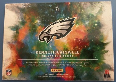 The 2021 Panini Origins Kenneth Gainwell Rookie Jersey Patch Auto RPA Eagles trading card is a highly sought-after collectible featuring a patch of the player's jersey along with his autograph. This card is officially licensed by the National Football League (NFL) and authenticated by Panini Authentic. As a rookie card from the 2021 season, it holds value for collectors looking to add a unique piece to their sports trading card collection. The card is part of the Panini Origins set and showcases the Philadelphia Eagles player Kenneth Gainwell, making it a must-have for fans of the team.