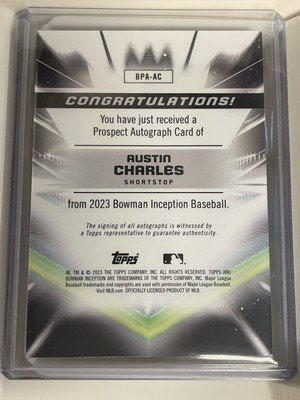 Elevate your collection with the 2023 Bowman Inception Austin Charles #92 card, an authentic piece of sports memorabilia. Highlighted by Austin Charles's hard-signed autograph, this card is a true rookie card goldmine for fans and collectors. The card, numbered BPA-AC, is a standout with its gilded gold parallel variety, making it a rare treasure, especially as it's limited to just 50 pieces.