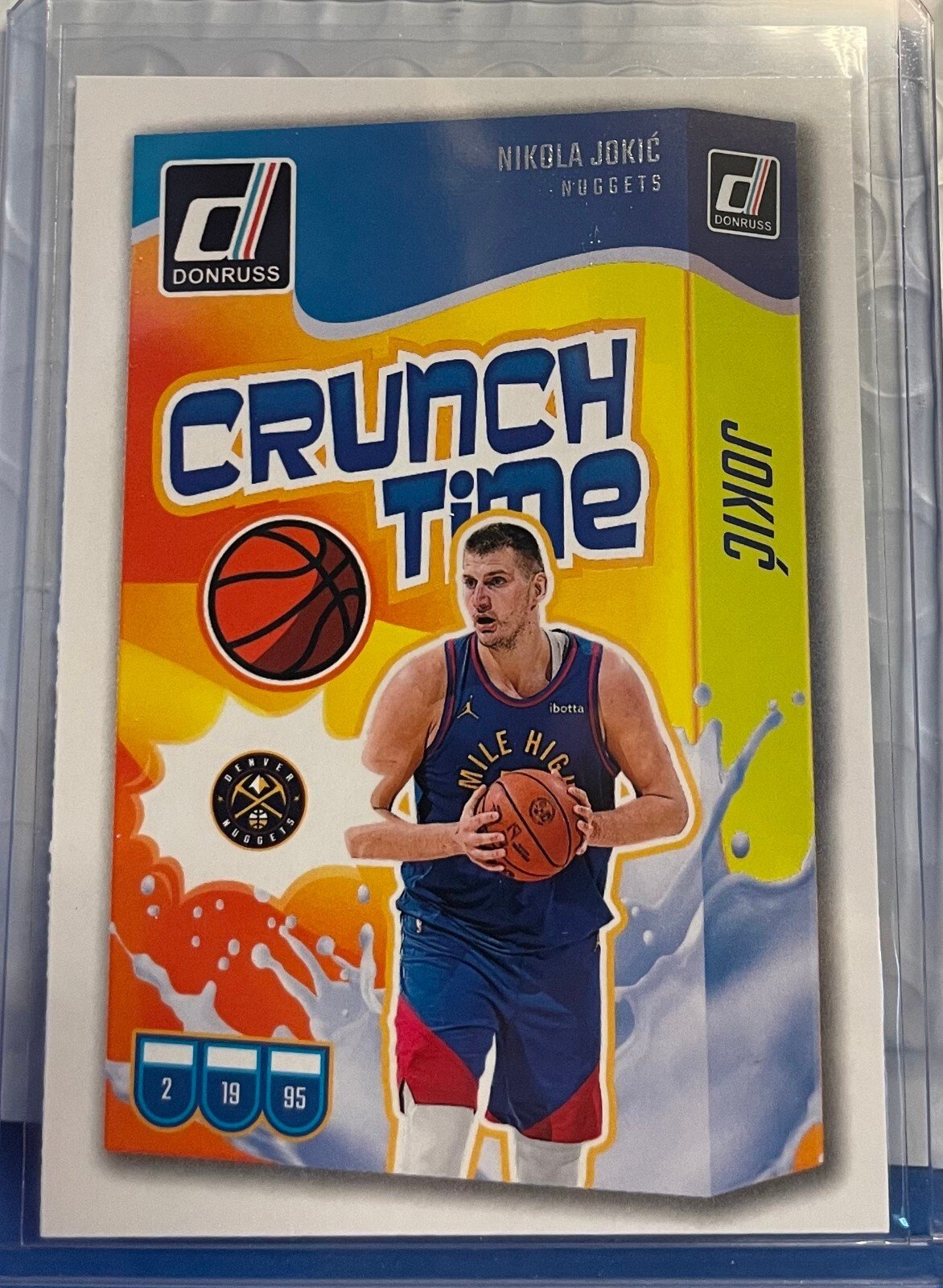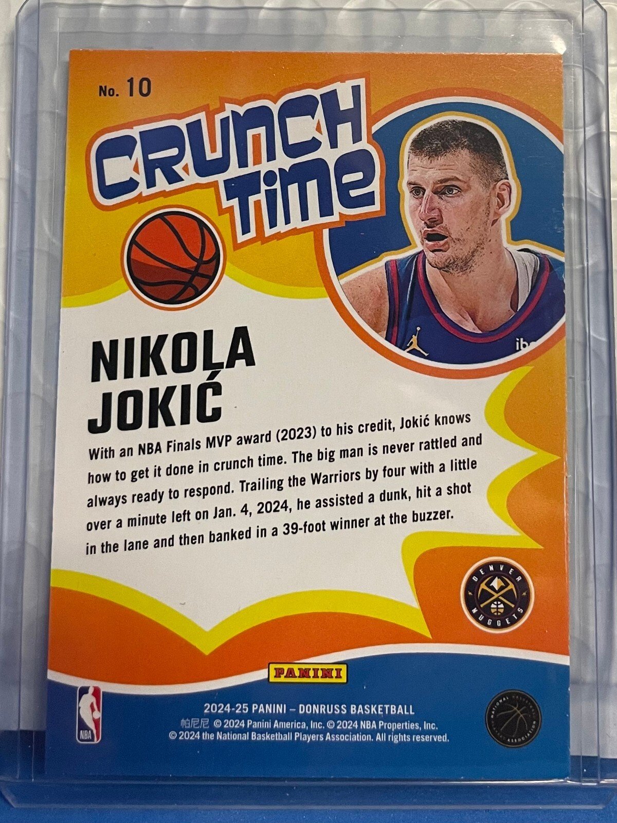 Crafted by Donruss, a trusted name in sports memorabilia, this card is part of a set known for its quality and collectibility. The card features a dynamic image of Jokić in action, and with its identification as Crunch Time #10, it holds a special place within the series, celebrating the 2024-25 basketball season.