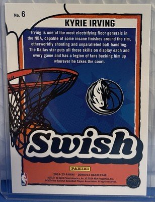 Elevate your basketball card collection with the 2024-25 Donruss Basketball Swish #6 featuring the Dallas Mavericks' star player, Kyrie Irving. This Panini-manufactured sports trading card captures the essence of the game with its stunning design and high-quality print.