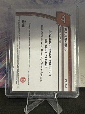 The product is a 2024 Bowman University Chrome Prospect Auto card featuring Ali Jennings, a football player from Virginia Tech. This single-insert trading card is autographed by Jennings, making it a valuable collectible for fans and collectors. The card is part of the Chrome Prospect Autographs set by Topps, known for its high-quality and sought-after rookie cards. With a unique card number and original manufacture, this item is a must-have for any sports trading card enthusiast looking to add a piece of football history to their collection.