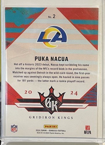 This 2024 Donruss Gridiron Kings Puka Nacua #2 trading card is a must-have for any Los Angeles Rams fan. Featuring the talented Puka Nacua, this sports trading card is an insert with a parallel/variety design. It is perfect for collectors who appreciate unique and rare items.