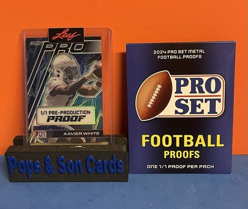 The 2024 Leaf Pro Set Metal Proof Pulsar Goin’ Pro Blue trading card features Xavier White, a player in the National Football League (NFL). This 1/1 card is a Pre Production Proof parallel variety from the set, printed on card stock and manufactured by Leaf. The card is serial numbered and labeled as a Rookie football card for the 2024 season. It is an original release in English and comes with free shipping within the United States.