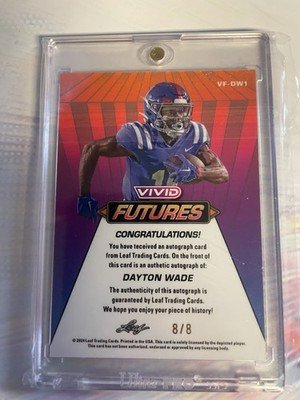 The 2024 Leaf Vivid Football trading card featuring Dayton Wade's Red Mojo Futures Auto 8/8 is a highly sought-after collectible for football fans and card collectors. This single card is autographed by Dayton Wade, signed in hard format and authenticated by Leaf. With a limited print run of only 8, this original card from the 2024 Leaf set is a rare find, making it a valuable addition to any sports trading card collection. The card is made of 35 Pt. thickness and includes features such as serial numbering, parallel/variety, rookie designation, and insert design, adding to its appeal and uniqueness.