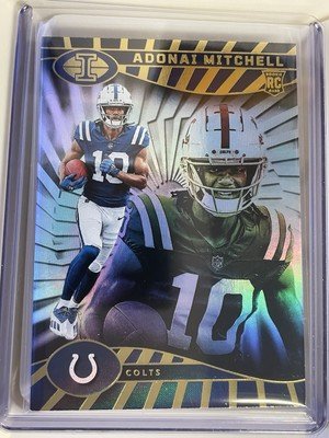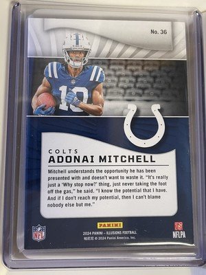 Elevate your football card collection with the 2024 Panini Illusions #36 Adonai Mitchell RC Colts trading card. This rookie card captures the potential and excitement of the Indianapolis Colts' new talent, Adonai Mitchell. As part of the 2024 Panini Illusions set, it's a must-have for enthusiasts and collectors alike, showcasing the finesse of Mitchell's early NFL career.