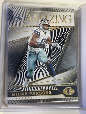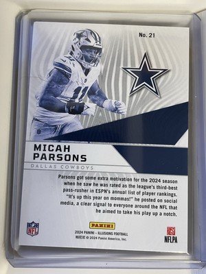 Capture a piece of football history with the 2024 Panini Illusions Micah Parsons Amazing #21 card. This collectible features the standout Dallas Cowboys linebacker in stunning detail, commemorating his dynamic presence on the field. Part of the coveted 2024 Panini Illusions set, this card is a must-have for fans and collectors alike.