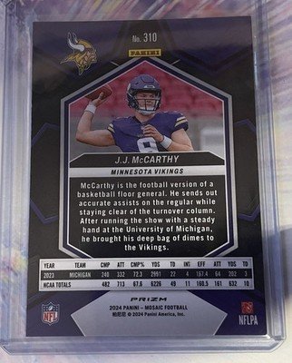 The product is a 2024 Panini Mosaic JJ McCarthy #310 Silver Mosaic Prizm rookie trading card featuring the player from the Minnesota Vikings in the National Football League (NFL). This original card manufactured by Panini is a sought-after collectible item for football fans, showcasing a parallel variety design in English language. Perfect for collectors looking to add a unique and valuable piece to their sports trading card collection.