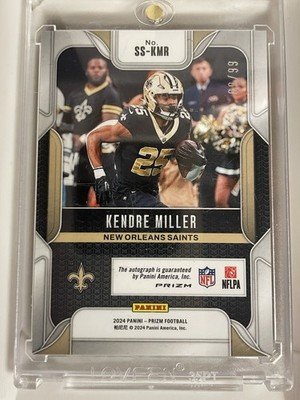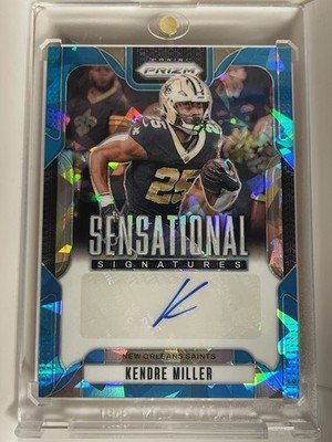The 2024 Panini Prizm Sensational Signatures Blue Ice 69/99 Kendre Miller #SS-KMR trading card is a highly sought-after collectible item for football fans and card collectors alike. This autographed card features Kendre Miller's signature, making it a valuable addition to any collection. With its limited run of only 99 cards, the Blue Ice Prizm parallel adds a unique shine to the card, making it even more desirable for collectors looking for exclusive pieces. The card is authenticated by Panini Authentic, ensuring its authenticity and appeal to fans of the New Orleans Saints and Kendre Miller.