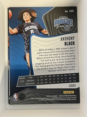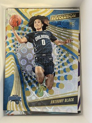 Capture the excitement of the hardwood with the 2024 Panini Revolution Basketball Anthony Black Rookie Card #105. This collectible card showcases the burgeoning talent of Anthony Black, dressed in the striking colors of the Orlando Magic. The card, part of the sought-after 2024 Panini set, is a must-have for any basketball enthusiast or card collector.