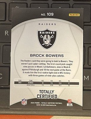The 2024 Panini Totally Certified – Rookies Brock Bowers #109 Mirror (RC) trading card is a highly sought-after collectible item for football fans. Part of the National Football League (NFL) set, this card features rookie player Brock Bowers from the Las Vegas Raiders. With a distinctive Mirror parallel variety