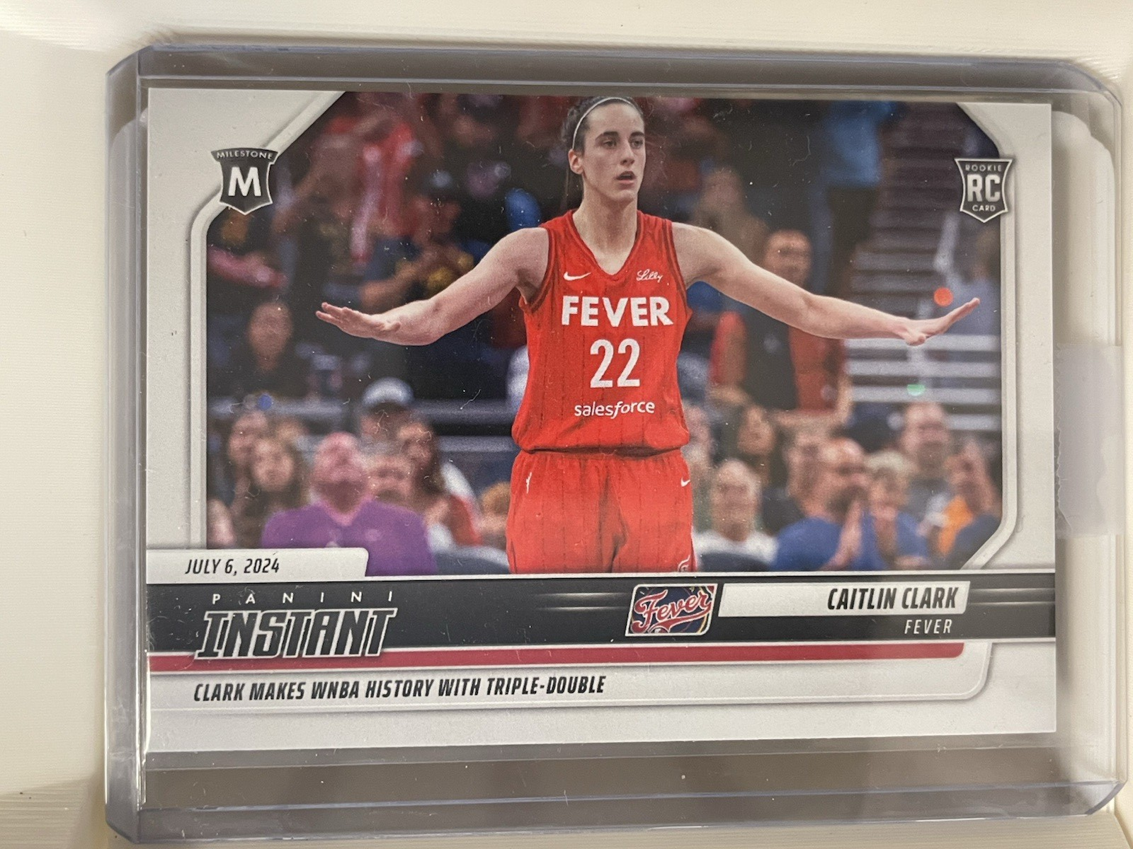 The product is a 2024 Panini WNBA Instant trading card featuring Caitlin Clark, a rookie player for the Indiana Fever, making WNBA history with a triple-double. This limited edition card, part of the Panini Instant set with a print run of 10151, is made of 20 Pt. card stock. The card is in English and celebrates Clark's milestone achievement in the Women's National Basketball Association (WNBA) league.