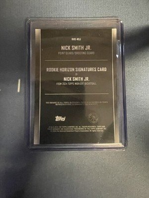 The 2024 Topps Midnight trading card features an autographed rookie card of Nick Smith Jr. from the Charlotte Hornets. Authenticated by Topps, this basketball card is a valuable addition to any sports memorabilia collection. With a label or sticker autograph and parallel variety, this card captures a promising player's signature in the National Basketball Association (NBA) season of 2024. A must-have for fans and collectors alike, this limited edition card showcases the talent of a rising star.