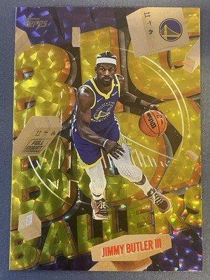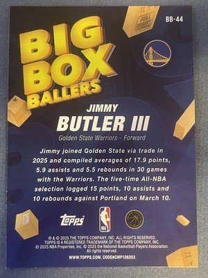 The 2025-26 Topps NBA trading card featuring Jimmy Butler, part of the "Big Box Ballers" set, is a standard-sized card made of card stock. This original card, manufactured by Topps, showcases Butler in his Golden State Warriors uniform and is autographed in hard-signed format. The card is part of an NBA Finals event/tournament, making it a valuable addition to any basketball trading card collection. With its unique features and insert design, this card is a must-have for fans of Jimmy Butler and the NBA.