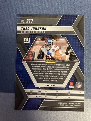 The 2025 Mosaic Football Theo Johnson Purple Scope Prizm #217 trading card is a standard-sized collectible featuring the player Theo Johnson from the New York Giants in the National Football League (NFL). Manufactured by Panini as part of the 2025 Panini set, this original card is made of card stock with a 20 Pt. thickness. The card is in English and does not come autographed; however, it includes a label or sticker autograph from Jakobi Meyers. This sports trading card is a unique variety with a Scope Prizm parallel, making it a desirable addition for any football card collector.