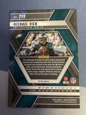 The 2025 Panini Mosaic #215 Michael Vick Scope Purple trading card is a collectible item featuring the former NFL player Michael Vick from the Philadelphia Eagles. This card is part of the 2025 Panini Mosaic set and belongs to the Scope Purple subset. It is a non-autographed card manufactured by Panini, with English language text. This rare card is a sought-after piece for sports trading card enthusiasts and fans of Michael Vick.