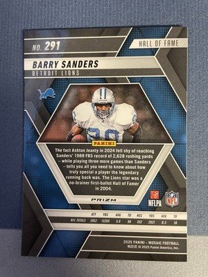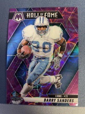 The 2025 Panini Mosaic Football trading card featuring Barry Sanders #291 Hall of Fame Purple Scope Prizm is a highly sought-after collectible for football fans. This standard-sized card from the National Football League (NFL) showcases the legendary player in a unique Purple Scope Prizm parallel, making it a standout addition to any sports trading card collection. As an original insert from the Hall of Fame set, this card is made of high-quality card stock with a thickness of 20 Pt., and is a must-have for fans of the Detroit Lions and football in general.