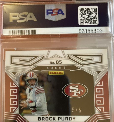 This Brock Purdy 2023 Panini Obsidian trading card is a must-have for any San Francisco 49ers fan or sports card collector. The card features an autographed label or sticker from the player himself, making it a unique and valuable addition to your collection. With a print run of only 5, this card is a rare find and is signed by the player himself.