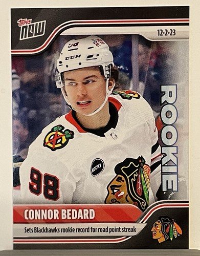 This sports trading card features the rookie record streak of Connor Bedard, a rising star in the National Hockey League (NHL). The card is from the 2023-24 NHL Topps Now set, manufactured by Topps. It showcases Bedard in his Chicago Blackhawks uniform and includes his card number 52.