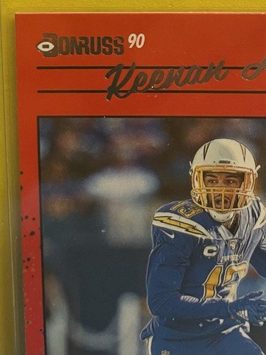 The product is a 2020 Panini Donruss sports trading card featuring Keenan Allen of the Los Angeles Chargers in the National Football League (NFL). This particular card is part of the Retro 1990 set, showcasing a vintage design from that era. It is an original card, not a reprint, and does not feature an autograph. Keenan Allen is the highlighted player on this standard-sized trading card, making it a collectible item for football fans and card enthusiasts.