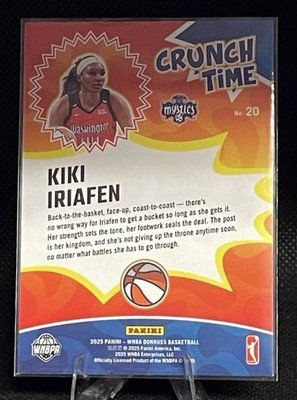 The product is a Kiki Iriafen Rookie Card from the 2025 Panini Donruss WNBA set, featuring a Diamond Holo SSP design. This card is made of card stock with a 20 Pt. thickness, manufactured by Panini in the United States. It is an original insert in the Crunch Time subset.