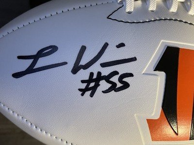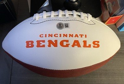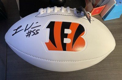The product is an autographed football by Logan Wilson of the Cincinnati Bengals, authenticated by Beckett Authentication Services. This original piece, signed by the player himself, is a perfect addition for any football fan or collector looking to own a unique and authenticated piece of sports memorabilia. The white panel design adds a stylish touch to the ball, making it a standout piece in any collection.