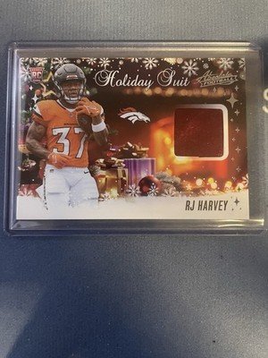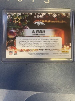 The RJ Harvey 2025 Panini Absolute Countdown Calendar Holiday Suit #HS-RHY (RC) trading card is a standard-sized football card featuring player RJ Harvey from the Denver Broncos. This original card, manufactured by Panini, is part of the 2025 Panini Absolute set and includes a patch from a holiday suit insert set. It is autographed by Jakobi Meyers, with the autograph authenticated by Panini Authentic. The card is made of card stock with a thickness of 108 Pt. and is a rookie card from the National Football League (NFL) season of 2025.