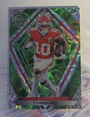 The product is a 2020 Panini Spectra Green Prizm trading card featuring Tyreek Hill of the Kansas City Chiefs in the National Football League (NFL). This sports trading card has a standard size and is manufactured by Panini. It is a 100 Pt. card with a parallel variety of Green Prizm, making it a unique and desirable collectible for football fans and card collectors.