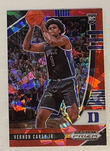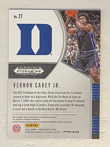 This is a stunning Vernon Carey Jr 2020-21 Panini Prizm Draft Picks Red Prizm Rookie Card # 27. The card features the Charlotte Hornets player in a National Basketball Association (NBA) league setting. It is a standard-sized sports trading card manufactured by Panini in the United States.
